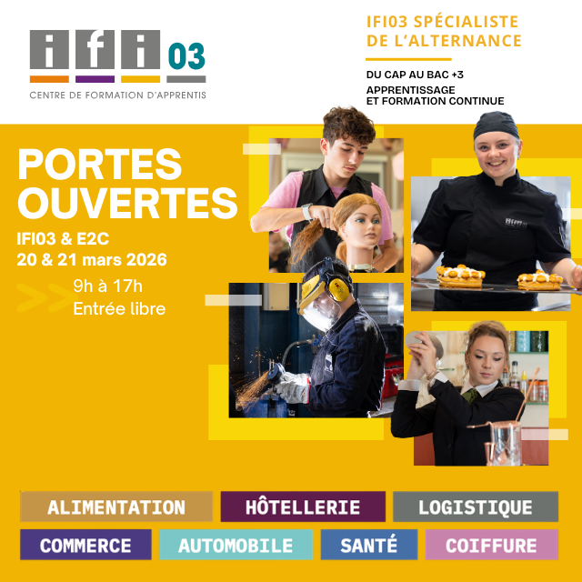 Fort de son expérience, IFI03 propose plus de 35 formations qualifiantes débouchant sur 20 métiers répartis dans les secteurs de l’alimentation, de la coiffure, du commerce, de la mécanique, de la carrosserie automobile, de l’hôtellerie et de la santé.
